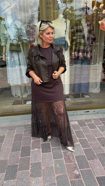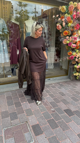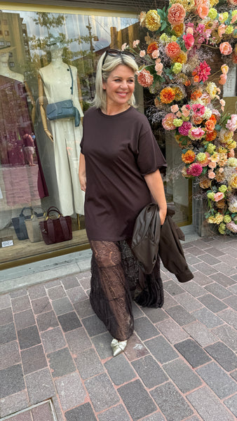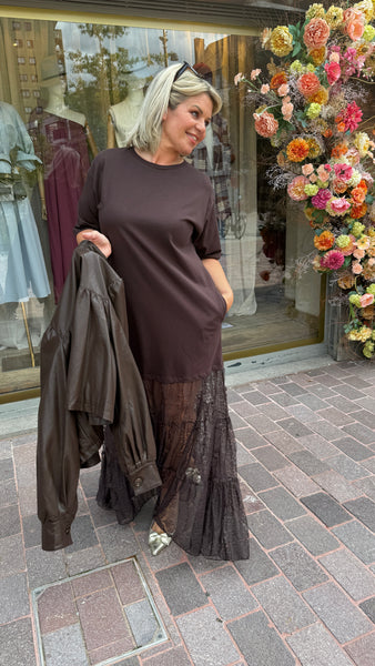 Lange jurk/kant/ MARIE-ANNE/ chocolade bruin.