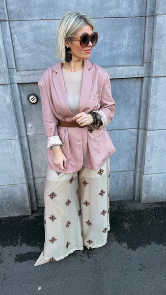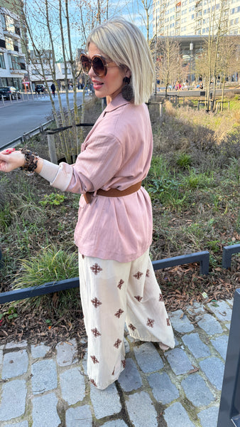 Blazer valt oversized uit maar kan door de riem getailleerd worden.