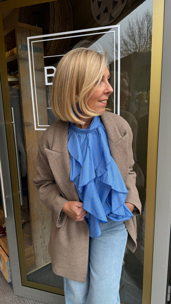 Lange blazer in 65% wol,25% polyester,7% nylon,3% autre vibes.