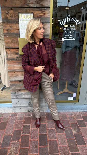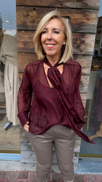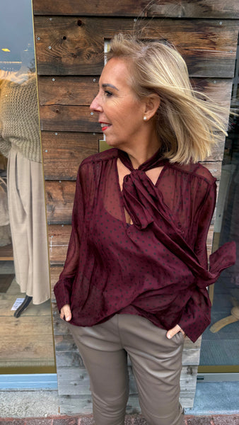 Hemd in bordeaux met strik en zwart/ bruine polkadot.