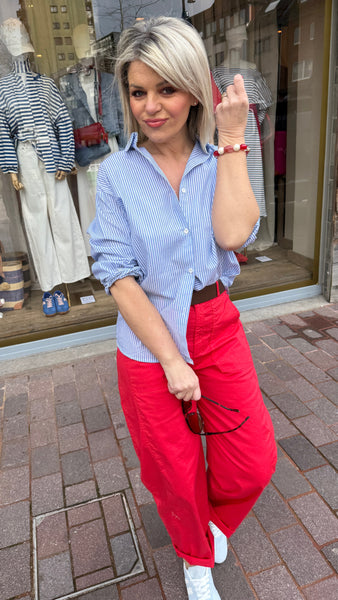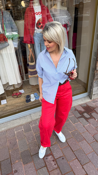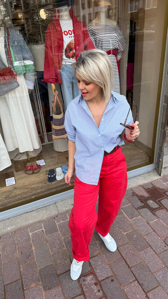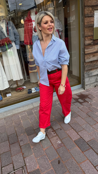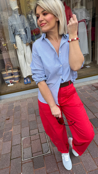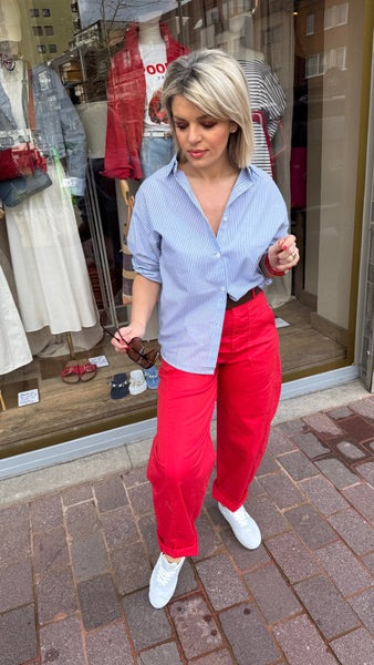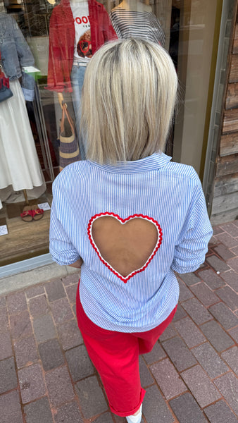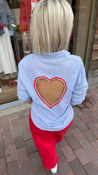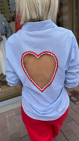 Hemd met lichtblauwe streep en rood open hart op de rug.