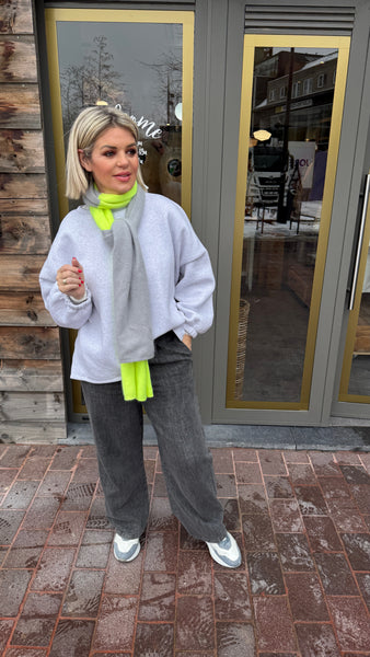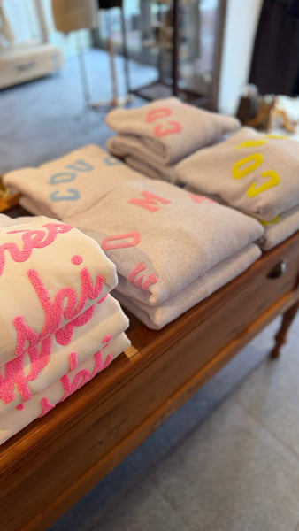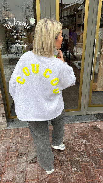 Grijze sweater met COUCOU tekst.